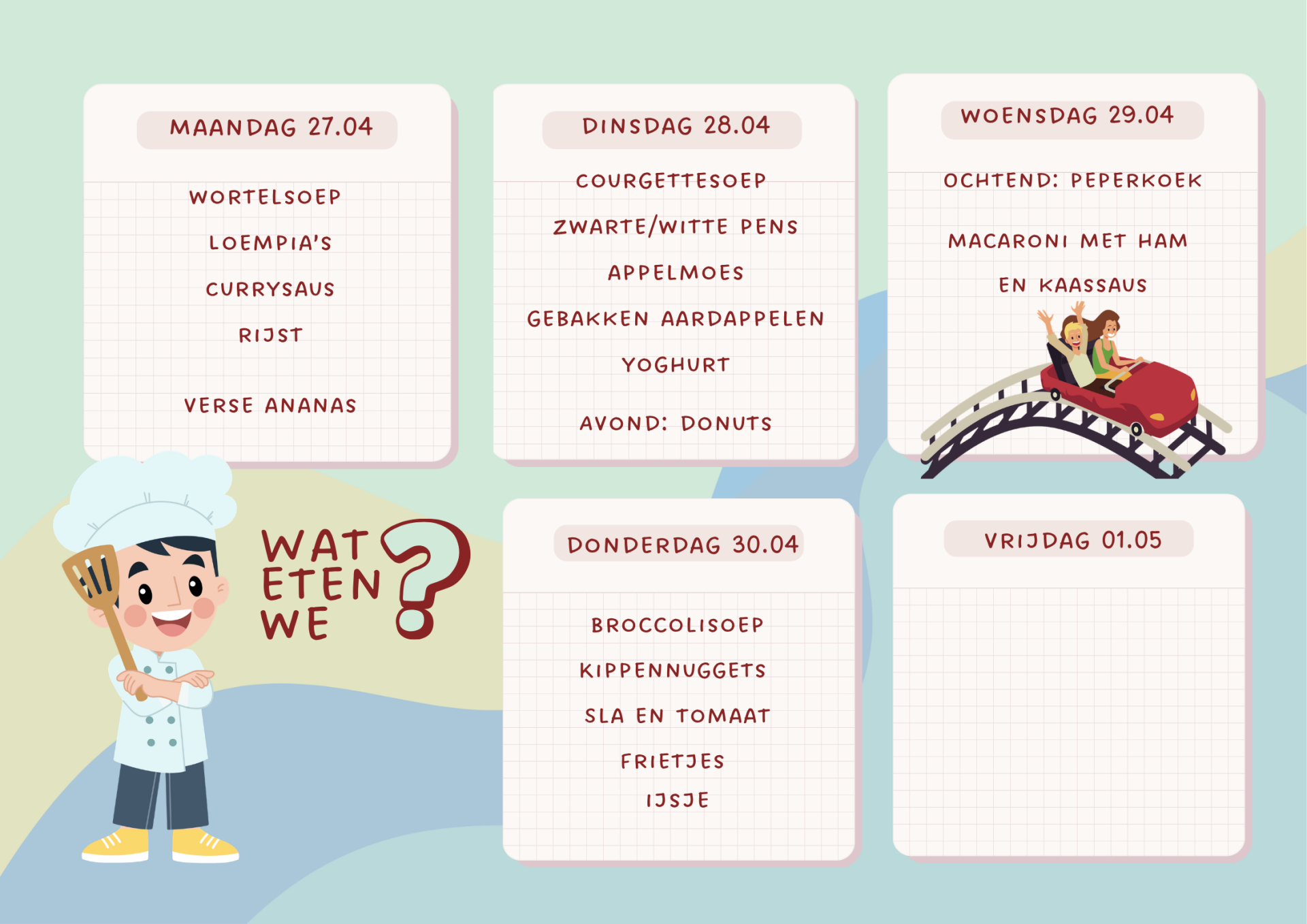 We proberen jullie kinderen dagelijks een gevarieerde en gezonde maaltijd aan te bieden, met verse producten.